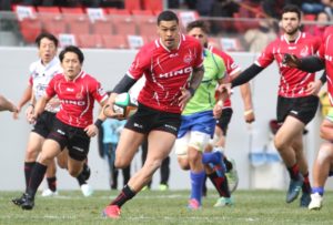 14分日野、NEC陣ゴール前右スクラムから展開し連続攻撃、ラックから⑨橋本⑮デブラシーニ⑭ペニーT。G成功7点
