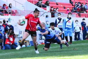 前半25分までは互いに譲らずゼロスコアが続いたが、日野がシンビン1名を出してから均衡が崩れた。