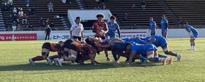 前半、風上の日野は試合を完全に支配した。スクラムで優位に立つと出だしの良いディフェンスから愛知にプレッシャーを与え愛知の「強み」を完全に消した。日野はターンオーバーから先制トライを奪うと勢いに乗り連続トライ!前半で3トライ。得点は16点差を付けて前半を折り返した。