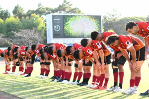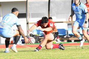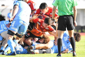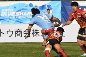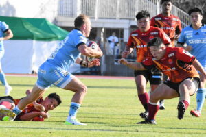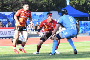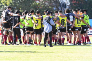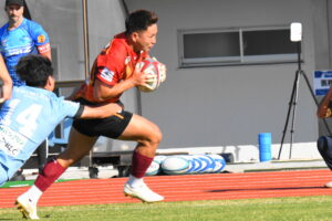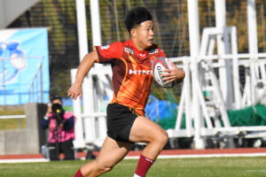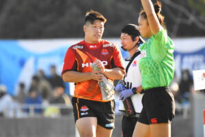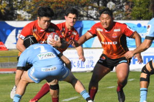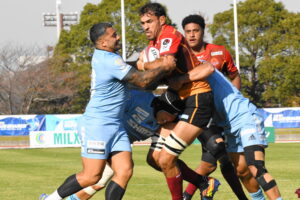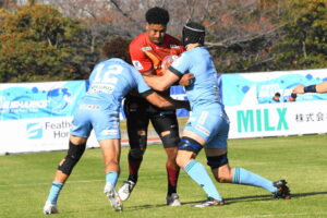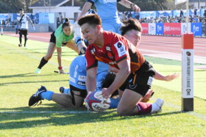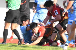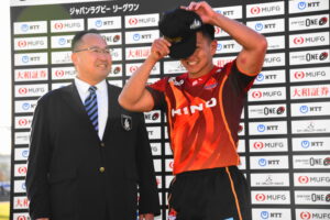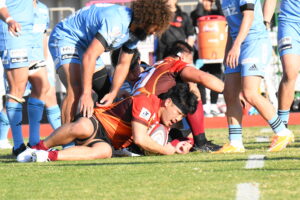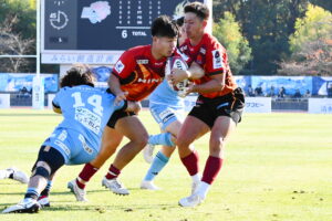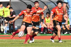 後半、先制点を挙げたい日野はゴール前のチャンスを生かし連続攻撃から左へ展開して⑪大内が2本目のトライを挙げた。一気に引き離したい日野は10フェーズに及ぶ連続攻撃から最後は⑪大内が3つ目のトライを挙げリードを拡げた。しかし、江東の反撃に合いトライを許し点差を詰められ緊張感のある状況が続いた。そんな中、江東⑩がハイタックルでイエローカードとなると一気に流れは日野に。前線のフォワードが優位に立つと、ラインアウトを起点としたモールから⑲中鹿が2トライを挙げて勝利を決定付けた。日野は合計4トライを挙げボーナスポイントを追加し勝点『5』を獲得した。