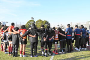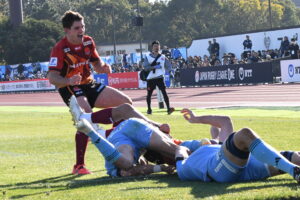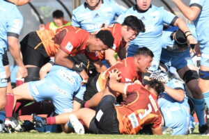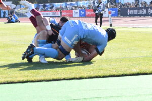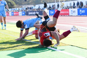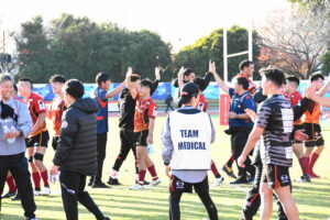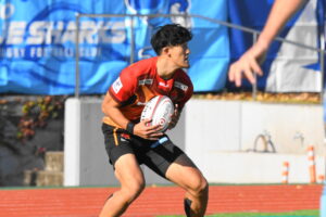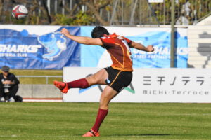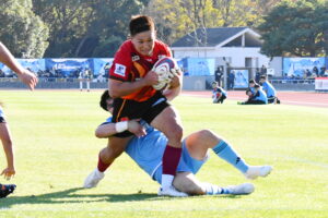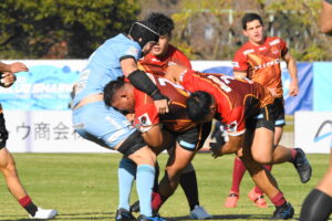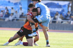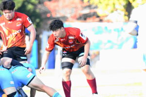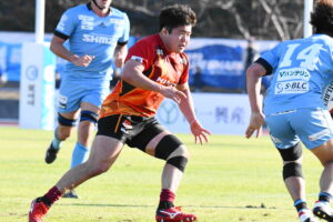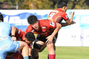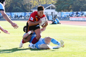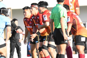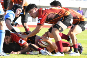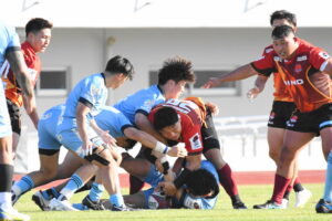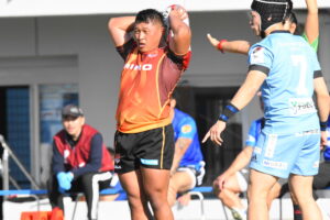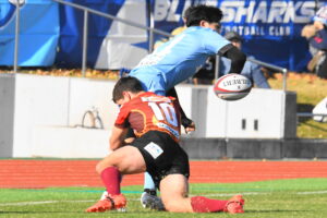 先制点は江東。日野の反則からペナルティゴールを決めた。日野もすぐにペナルティゴールで振り出しに戻すと、その後ゴール前のラインアウトから展開して⑪大内に繋ぎトライ!5点リードしたが、前半終盤に反則からペナルティゴールを許し2点差(前半8-6)で前半を折り返した。