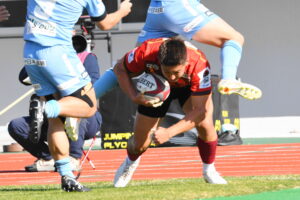 18分、日野 ゴール前右、ラインアウト、サイド攻撃を仕掛けて展開⑨橋本⑩ヒッキー⑮高野⑪大内と繋ぎトライ!5点G失敗