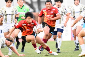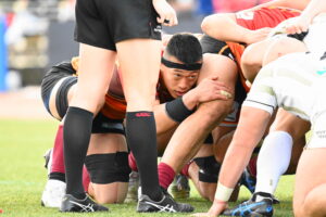 28分、広島 ゴール前右、ラインアウトから連続攻撃、ラックから㉑⑩⑨⑭と繋ぎトライ 5点G失敗