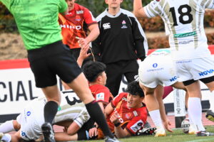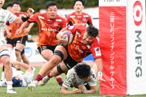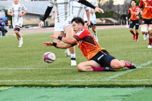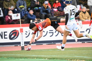 30分、日野 ゴール前左、ラインアウトからモールを押し込み⑨橋本がサイドを突きトライ!5点G成功2点