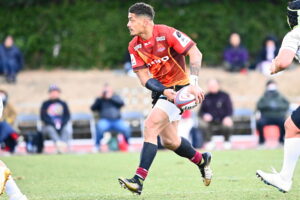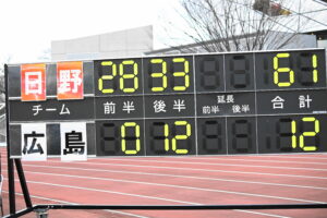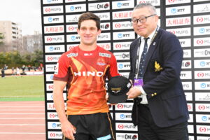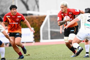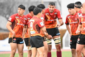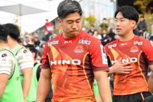 後半、前半の勢いをそのままに日野は10分にターンオーバーからボールを繋ぎ⑩ヒッキーがトライを挙げる。16分に日野はゴール前まで攻め込むが広島⑩にパスカットされ約100m独走のトライを許した。しかし、日野は21分ラインアウトからの連続攻撃、最後は⑨橋本⑥中鹿と繋ぎトライ!24分サインプレーから展開し⑨橋本㉒土肥⑩ヒッキー⑭小島と繋ぎトライ!28分に広島に2つ目のトライを許すが、31分相手のミスボールを逃がさず㉓川井がキック&チェースでトライ!最後の最後まで攻める気持ちを魅せる日野は42分この試合9本目となるトライを㉑篭島からパスを受けた⑲トビオが力強い突破で決めた。ノーサイド!(後半33-12)。