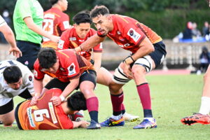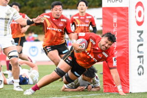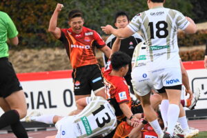 10分、日野 自陣22m中央、ターンオーバーから連続攻撃ラックから⑨橋本⑥中鹿⑩ヒッキー⑲トビオ⑪大内⑩ヒッキーと繋ぎトライ!5点G成功2点