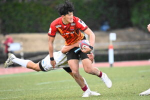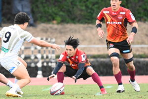 24分、日野 22m中央、ペナルティからサインプレー左へ、ラックから⑨橋本㉒土肥⑩ヒッキー⑭小島と繋ぎトライ!5点G失敗
