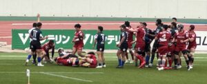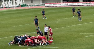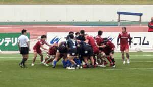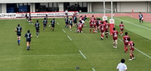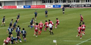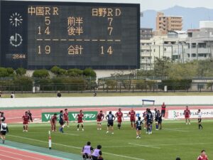 後半、先手を取りたい日野であったが、なにがなんでも勝ちたい中国のプレッシャーを受け、4分に先制パンチを食らう。中盤で日野ボールを中国⑪にインターセプトされて60mの独走トライを許した。一方、日野は9分にスクラムから展開して連続攻撃、ラックから⑨橋本⑭川井⑫床田⑪大内と繋ぎトライを返す。とても粘る中国は20分に日野ボールを奪い大きく展開してビッグゲインすると最後はラックから⑨⑤⑳と繋ぎ見事なトライを挙げた。『全勝優勝』を目指す日野は30分と36分にモールを起点としてトライを挙げ7点のリード(26-19)。しかし、日野は最後まで諦めない中国に対して40分にラインアウトからモールを押し込まれてペナルティトライを許し同点に追いつかれる(26-26)。その直後のキックオフ後のプレーからペナルティを奪った日野は⑩土肥がサヨナラのペナルティゴールを狙うがボールは惜しくもゴールポストの左へ。ノーサイド。