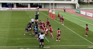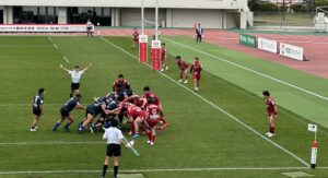 9分、日野 中盤左、スクラムから展開、連続攻撃、ラックから⑨橋本⑭川井⑫床田⑪大内と繋ぎトライ!5点G成功!2点