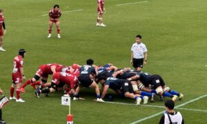 30分、日野 ゴール前左、ラインアウトからモールサイドを⑧ウルフが突きトライ!5点G失敗