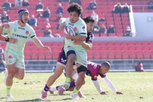 後半、主導権を握りたい日野は3分に連続攻撃から一旦は花園にターンオーバーされたボールを奪い返すと見事な連携プレーで⑨篭島⑩ヒッキー⑬岩下⑥中鹿⑧堀江と繋ぎ逆転のトライ!しかし、11分花園にトライを許し逆転される。粘る日野15分ラインアウトからモールを押し込み展開すると⑩ヒッキーから⑭小島へキックパスが見事に通りトライ!再逆転!続けて得点を挙げたい日野だが我慢出来ず、18分31分34分と花園の猛攻を受け3連続トライを許し一気に突き放された。ノーサイド間際に⑫アロフィポがトライを挙げて13点差に詰めるが時遅し...(34-47)。残念ながら花園の壁を超えることは出来なかった。