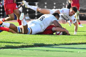 15分、日野、ゴール前左、ラインアウトモールを押し込み展開⑨篭島⑫床田⑩ヒッキー⑮アロフィポと繋ぎトライ!5点G成功2点(7-7)