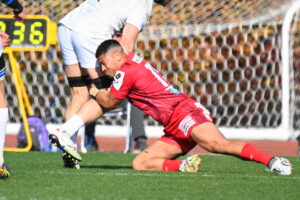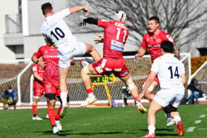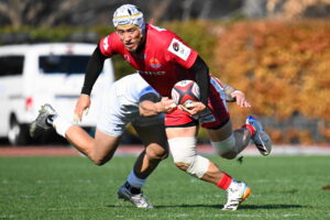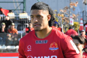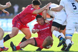 後半、日野は風下となり自陣での戦いを強いられる。6分江東はラインアウトから展開して力強く突進した⑦にトライを許し14点リードされる。負けられない日野はここから20分間以上『我慢』と『粘り』を魅せた。江東の波状攻撃を懸命なタックルで防ぎ耐えると、日野は29分に相手陣10mラインアウトから展開し素晴らしい連続攻撃を魅せて10次攻撃の末に⑨篭島②谷口⑧フェナー㉒コスターと繋ぎトライ!再び7点差に詰めた。